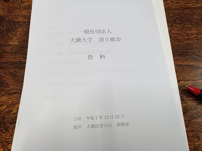 12/23(火)に一般社団法人 大潮大学の設立総会を行いました。目的は既存する木造の旧大潮小学校を活用し出店・物品販売・各種イベント等を行い、関係人口を増やして地域の活性化に繋げて行く事業になります。今後は、計画に沿って関係者の皆さんのご協力を得ながら事業を進めて行きたいと考えています。